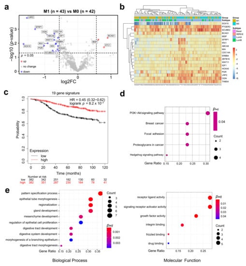 A total of 19 DEGs are differentially expressed in M1 and associated with survival. (a) Volcano plot of differentially expressed genes (DEGs). Cutoffs: p-value = 0.05, log2 FC = 0.586. Due to limited space THBS4, PTGER3, SFRP4, HSPA2, and ZBTB16 are not labeled. (b) Heatmap of DMFS-related 19 DEGs. (c) Prognostic value of the 19 DEG signature utilizing various independent datasets available in the Kaplan–Meier Plotter tool. (d) Kyoto Encyclopedia of Genes and Genomes (KEGG analysis of DMFS-related 19 DEGs. (e) Gene Ontology (GO) analysis of DMFS-related 19 DEGs.