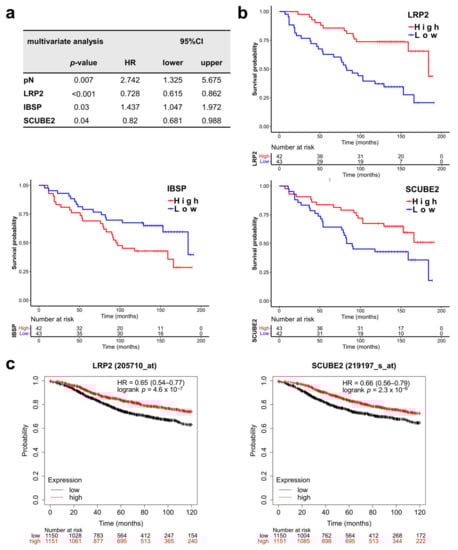 LRP2, SCUBE2, and IBSP are independent prognostic factors. (a) Multivariate analysis of differentially expressed BC360 signatures and single genes as well as pN and pT (detailed test results are in Table S2). (b) Overall survival curves were stratified by the genes that were significantly associated with survival in the multivariate analysis. (c) LRP2 and SCUBE2 are prognostic for patients from databases (Kaplan–Meier Plotter). CI, confidence interval. HR, hazard ratio.