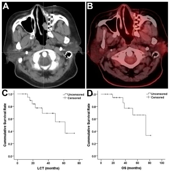Short-term and long-term efficacy of stereotactic ablative brachytherapy (SABT) for recurrent head and neck adenoid cystic carcinoma (HNACC). (A,B) showed the complete response of one patient 3 months after SABT. (C,D) showed the LCT and OS of all patients.