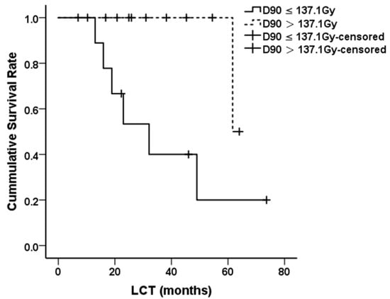 Univariate analyses for LCT (Table 2) showed that the patients with higher D90 (>137.1 Gy) had a more favorable LCT than those with lower doses (61.7 months versus 32.1 months, p = 0.048) (Figure 2). Multivariate analyses were not carried out due to the low event rate.