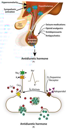 It has long been known that SSRIs can cause drug-induced SIADH. Hyponatremia occurs in as many as one in three patients taking an SSRI [20]. Many antipsychotic agents (including both typical and atypical dopamine receptor antagonists) also cause drug-induced SIADH [21], in part by attenuating K+ conductance within posterior pituitary nerve terminals [22]. An example is provided schematically in Figure 1B, wherein dopaminergic antagonists inadvertently alter ion channel function leading to excessive ADH release as an adverse drug reaction. Similar perturbations in posterior pituitary membrane conductance have been observed for opioid analgesics [23,24,25]. In clinical practice, however, the strength of association between opioids and SIADH does not appear to approach the magnitude of the association between SSRIs and SIADH [26]. Another class of drugs strongly associated with SIADH has been the anti-seizure drugs [27]. Carbamazepine and oxcarbazepine cause hyponatremia quite often [28]. As many as one in four patients using carbamazepine in a seizure clinic develop hyponatremia [29]. Like many of the drugs discussed above, these agents also increase circulating ADH levels through a central mechanism involving the regulation of membrane bound ion channels [30].