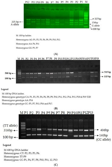 The microR-126 rs4636297 A > G SNP was genotyped by ARMS-PCR (Figure 1A). The genotyping of three SNP of PIK3R1 gene, the PIK3R1 rs7713645 A→C (Figure 1B), PIK3R1 rs706713 C→T (Figure 1C) and PIK3R1 rs3730089 A→G (Figure 1D) by ARMS-PCR. The primers for all four SNPs were designed by using primer3 software as depicted in Table 2. The ARMS-PCR was done in a reaction volume of 25 µL containing template DNA (50 ng), FO −0. 30 µL, RO −0. 30 µL, RI −0. 20 µL, RI −0. 20 µL of 25 pmol of each primers and 10 µL from GoTaq® Green Master Mix (cat no M7122) (Promega, Madison, WI, USA). The final volume of 25 µL was adjusted by adding nuclease free ddH2O. Finally, the 2 µL of DNA was added from each patient. The thermocycling conditions used were at 95 °C for 10 min followed by 40 cycles of 95 °C for 35 s, annealing temperature PIK3R1 rs706713 C→T (58 °C) PIK3R1 rs3730089 A→G (60 °C), PIK3R1 rs7713645 A→C (55 °C) and microR-126 rs4636297 A > G (58 °C) for 40 s, 72 °C for 43 s followed by the final extension at 72 °C for 10 min. PCR products were separated on 2% agarose gel stained with 2 µL of sybre safe stain and visualized on a UV transilluminator from Biorad (Hercules, CA, USA).