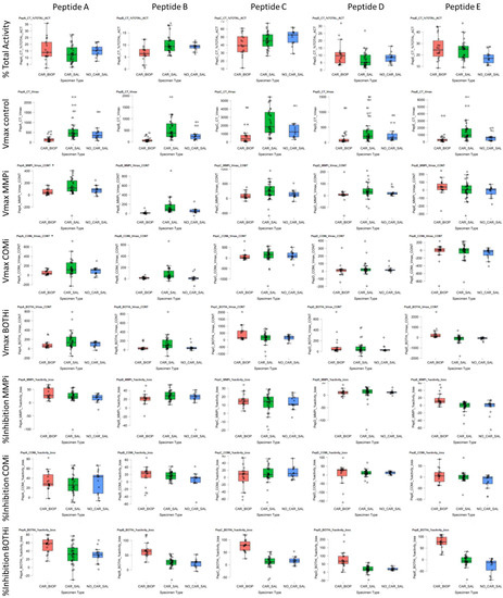 Boxplots for absolute (Vmax) and substrate turnover of peptides used and inhibitors (Vmax), relative (% TOTAL-ACT) substrate utilization across peptides (Peptides A–E), and contribution of inhibitor-doped samples (% Inhibition). Sample types were WMS, based on caries status (CAR/NO-CAR), and caries biopsy (BIOP) samples for the five peptides studied. Inhibitor data is expressed as Vmax contribution to signal and % inhibition by either Metalloproteases (MMPi), CSC proteases (COMi) or combined MMPi and COMi (BOTHi). relative (%CONT; percentage contribution to turnover; %Inhibition: Percentage inhibition of overall activity).