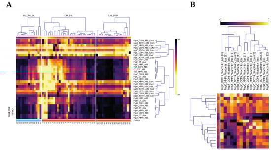 Normalized Pearson Bi-clustered heatmaps, (A) split by sample type for all absolute activities and (B) inhibitor contributions to turnover. Specimen were saliva (_SAL) samples examined and caries biopsies obtained (CAR_BIOP), representing relative substrate utilization for peptides (PepA–PepE) turnover in relation to overall activity (_CT_ABS) and inhibited contribution to turnover (_ABS_CONT). Inhibitors denote _COMi_ = COMPLETE, _MMPi = Metalloprotease inhibitor or _BOTHi, comprising a combination of both. The respective contribution of inhibitors (CONT) to Vmax is reported. Across all samples, a consistent CSC signal is observed for PepC (PepC_COMi_ABS_CONT). Saliva in caries positive subjects is delineated predominantly by an increase in pepE overall turnover, BOTHi inhibition and the reduced inhibitory effect of COMi and MMPi. The second cluster in caries is defined by the prevalence of increased MMP contribution for PepA and PepB. (B) relative inhibition observed for caries biopsies, highlighting the utilization of substrates by both MMP and CSC proteases.