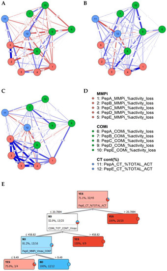 Correlating matched specimen types and preference in substrate use, several proteolytic clusters were observed in caries and saliva (Figure 2A,B). The caries biopsy material revealed a significant proportion of MMP contribution in lesions, which corresponded with increased salivary MMP levels, although diluted with other protease profiles targeting given peptides. Furthermore, the network analysis conducted demonstrated that most differential features between caries status in saliva could be aligned to caries-specific interactions, as highlighted in the partial correlation network (Figure 3A–D).