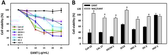 Cell viability. (A) Cell viability for several oral cancer cell lines and normal oral (HGF-1) cell lines in EANT treatments for 24 h MTS assay. (B) NAC (2 mM) pretreatment outcome of EANT treatments (0 and 25 μg/mL) for 24 h MTS assay. The cell viability of untreated controls for each oral cancer cell line was adjusted to 100%, which is not shown here. Data (means ± SD, n = 3) showing * differ in significance for paired comparisons (p < 0.05).
