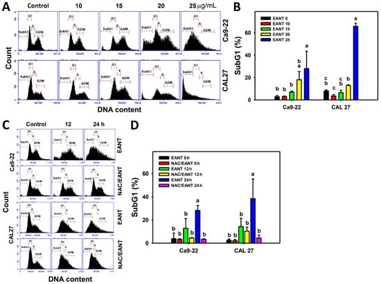 Cell cycle analysis. (A,B) Cell cycle patterns and statistical analysis for EANT treated oral cancer cells (CAL 27 and Ca9-22) over 24 h. (C,D) NAC (2 mM) pretreatment outcome to cell cycle patterns and statistical analysis in EANT treatments (0 and 25 μg/mL) for 12 and 24 h. Data (means ± SD, n = 3) with different letters on-top indicate significant differences for multiple comparisons (p < 0.05). One-way analysis of variance (ANOVA) with a post hoc test was applied to multiple comparisons. For example (Ca9-22 cells in Figure 2B), the EANT 0, EANT 10, EANT 15, and EANT 20 show “b and ba”, indicating nonsignificant differences between each other because they overlap with the same lowercase letter “b”. Similarly, the EANT 20 and EANT 25 show “ba” and “a”, indicating nonsignificant differences between each other because they overlap with the same lowercase letter “a”. In contrast, EANT 0, EANT 10, and EANT 15 show “b” and EANT 25 shows “a” indicating significant differences among each other because they do not overlap with the same lowercase letter.