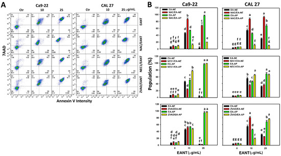 The apoptosis and necrosis of oral cancer cells following EANT treatment were assessed using the flow cytometry-based annexin V/7AAD method [28,41,42] (Figure 3A). For Ca9-22 and CAL 27 cells, EANT at a low concentration (10 μg/mL) induces a mixture of necrosis (Q1 in annexin V/7AAD) and apoptosis (Q2/Q3 in annexin V/7AAD) (Figure 3B). EANT at a high concentration (25 μg/mL) mainly induces apoptosis (Q2/Q3). Accordingly, EANT at higher concentration partly induces the switch of necrosis to apoptosis.