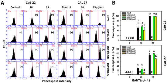 Pancaspase activation analysis. (A,B) Pancaspase flow cytometry and statistics. With the inhibitor pretreatments for oxidative stress, necrosis, and apoptosis (10 mM NAC for 1 h, 50 μM NEC1 for 1 h, and 100 μM ZVAD for 2 h), or not, oral cancer cells (Ca9-22 and CAL 27) were treated with EANT (control, 10, 25 μg/mL) for 24 h. Data (mean ± SD, n = 3) showing different letters on-top differ significantly for multiple comparisons (p < 0.05).