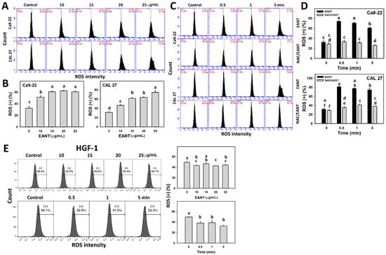 ROS analysis. (A,B) ROS pattern and statistical analysis for EANT treated oral cancer cells (CAL 27 and Ca9-22) for 5 min. (C,D) NAC (10 mM) pretreatment outcome to ROS patterns and statistical analysis in EANT treatments (0 and 25 μg/mL) for 0, 0.5, 1, and 5 min. (E) ROS pattern and statistical analysis for EANT treated normal oral (HGF-1) cells for different concentrations (0, 10, 15, 20, and 25 μg/mL for 5 min) and treatment times (25 μg/mL for 0, 0.5, 1, and 5 min) of EANT. Data (means ± SD, n = 3) showing different letters on-top differ significantly for multiple comparisons (p < 0.05).