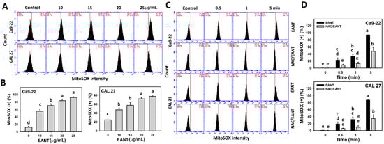 MitoSOX analysis. (A,B) MitoSOX patterns and statistical analysis for EANT treated oral cancer cells (CAL 27 and Ca9-22) for 5 min. (C,D) NAC (2 mM) pretreatment outcome to MitoSOX patterns and statistical analysis in EANT treatments (0 and 25 μg/mL) for 0, 0.5, 1, and 5 min. Data (mean ± SD, n = 3) showing different letters on-top differ significantly for multiple comparisons (p < 0.05).
