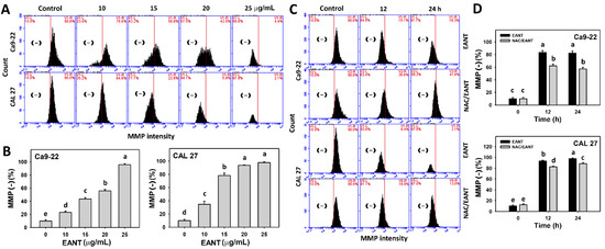MMP analyses. (A,B) MMP patterns and statistical analysis for EANT treated oral cancer cells (CAL 27 and Ca9-22) for 24 h. (C,D) NAC (10 mM) pretreatment outcome on MMP patterns and statistical analysis in EANT treatments (0 and 25 μg/mL) for 0, 12, and 24 h. Data (mean ± SD, n = 3) showing different letters on top differ significantly for multiple comparisons (p < 0.05).