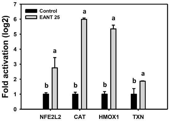 The antioxidant system commonly changes in response to oxidative stress [43,44]. The mRNA expressions of antioxidant genes such as NFE2L2, CAT, HMOX1, and TXN, were tested. EANT differentially induces these mRNA expressions (Figure 8).