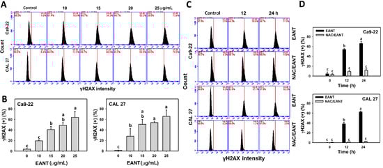 γH2AX analysis. (A,B) γH2AX pattern and statistical analysis for EANT treated oral cancer cells (CAL 27 and Ca9-22) for 24 h. (C,D) NAC (2 mM) pretreatment outcome on γH2AX patterns and statistical analysis in EANT treatments (0 and 25 μg/mL) for 12 and 24 h. Data (means ± SD, n = 3) showing non-overlapping alphabets differ significantly for multiple comparisons (p < 0.05).