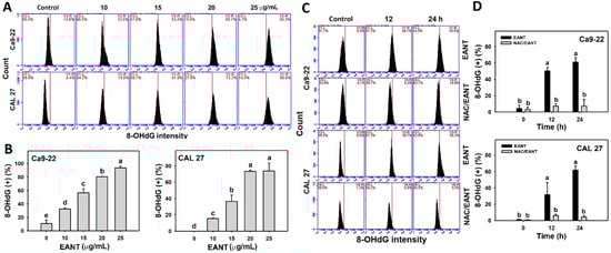 8-OHdG analysis. (A,B) 8-OHdG pattern and statistical analysis for EANT-treated oral cancer cells (CAL 27 and Ca9-22) for 24 h. (C,D) NAC (2 mM) pretreatment outcome on 8-OHdG pattern and statistical analysis in EANT treatments (0 and 25 μg/mL) for 12 and 24 h. Data (means ± SD, n = 3) showing different letters on top differ significantly for multiple comparisons (p < 0.05).
