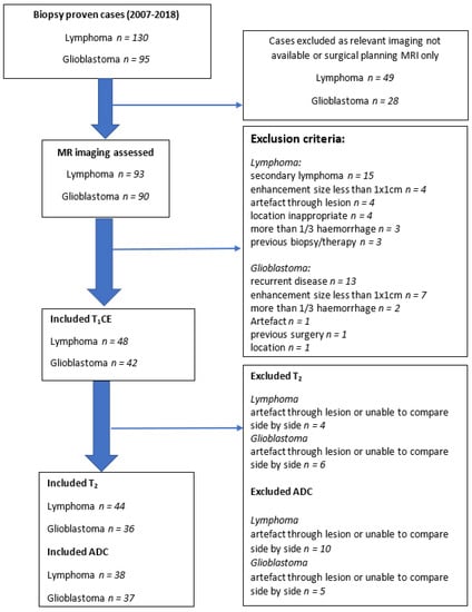 - Suh, H.B.; Choi, Y.S.; Bae, S.; Ahn, S.S.; Chang, J.H.; Kang, S.G.; Kim, E.H.; Kim, S.H.; Lee, S.K. Primary central nervous system lymphoma and atypical glioblastoma: Differentiation using radiomics approach. Eur. Radiol. 2018, 28, 3832–3839. [Google Scholar] [CrossRef]