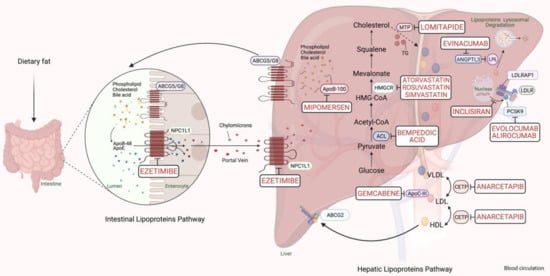 Scheme representing the cholesterol metabolism pathway and pharmacological targets for classical and novel lipid-lowering therapies (generated with BioRender.com). Unique hepatic and intestinal transporters (ABCG5 and ABCG8) release bile acids, phospholipids, and cholesterol into the biliary system. Inversely, the NPC1L1 protein modulates cholesterol returning to hepatocytes. Ezetimibe inhibits cholesterol entry into the intestine and liver by the NPC1L1 transporter. Next, chylomicrons are generated through the assembly of TG, cholesterol, and ApoB-48, and released into the blood circulation (see intestinal lipoproteins pathway). The speed-limiting enzyme of endogenous cholesterol synthesis, HMGCR (see hepatic lipoproteins pathway), is inhibited via statins. The activated bempedoic acid decreases the hepatic synthesis of acetyl CoA and cholesterol catabolism by blocking the ACL protein. ApoB-100, phospholipid, ApoC-III, and cholesterol assembly into VLDL depends on the activity of MTP, which is blocked by lomitapide. The degradation of hepatic messenger ribonucleic acid (mRNA) transcript of ApoB-100 and ApoC-III is mediated by mipomersen and gemcabene, respectively. The heteroexchange of TGs and cholesteryl esters between ApoB-lipoproteins particles relies on CETP activity, which is blocked by CETP inhibitors such as anacetrapib. LDLR interacts and removes LDL-cholesterol from the blood circulation with the assistance of LDLRAP1. Lysosomal catabolism of LDLR is mediated by PCSK9. Anti-PCSK9 antibodies, including evolocumab, alirocumab, and inclisiran inhibit the endogenous production and release of PCSK9. Evinacumab blocks the inhibition of hepatic lipoprotein lipase activity by ANGPTL3. Abbreviations: ApoB-48/100, Apolipoprotein B protein member 48 & 100; ApoC-III, Apolipoprotein C protein, member III; ApoE, Apolipoprotein E protein; HDL, High-density lipoprotein cholesterol; LDL, low-density lipoprotein; VLDL, very-low-density lipoprotein; TG, triglyceride; LDLR, LDL-receptor; LDLRAP1, LDLR-adaptor protein, member 1; ABCG2, atp-binding cassette, subfamily g, member 2; HMGCR, β-hydroxy-β-methylglutaryl Coenzyme A Reductase; NPC1L1, Niemann-Pick C1-like 1 transporter protein; ACL, adenosine triphosphate citrate lyase; MTP, microsomal triglyceride transfer protein; LPL, lipoprotein lipase; CETP, cholesteryl ester transfer protein; ANGPTL3, angiopoietin-like protein 3; PCSK9, proprotein convertase subtilin/kexin 9 protein.