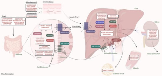 A schematic representation of the pharmacokinetic modulator genes involved in absorption, distribution, metabolism, and clearance of lipid-lowering therapy (created with BioRender.com). Oral lipid-antagonists enter the circulatory system via the enteric SLC and ABC gene-transporters. While intravenous anti-lipids enter directly into the circulation and reach the liver, the agents administrated subcutaneously are slowly absorbed through the blood capillaries. The liver and kidneys are the major metabolic sites for lipid-lowering medicines. The main catalytic proteins involved in their metabolic pathway are CYP and UGT, which inactivate or activate drugs. Members of the ABC family then mediate their elimination through kidneys, biliary, or intestinal pathways. Some drugs accumulate for a long-time in the muscle or adipose tissue. Abbreviations: ABCG2/5/8, atp-binding cassette, subfamily g, member 2, 5, or 8; SLCO1B1, solute carrier organic anion transporter 1B1; CYP3A4, Cytochrome P450, family 3, subfamily A, member 4; UGT2B7, uridine 5′-diphosphate (UDP)-glucuronosyltransferase 2B7; UGT1A1/3, uridine 5′-diphosphate (UDP)-glucuronosyltransferase 1A1 or 3.