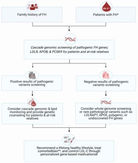 The wide variation of cholesterol-lowering therapies in terms of the potential adverse effect and therapeutic response is one of the main challenges in clinical practice, especially in FH patients. In addition to clinical and environmental factors, including race, gender, age, smoking, and adverse consequences, genomic phenotypes of LDLR, APOB, and PCSK9 can potentially modulate the sensitivity of anti-lipids. Over the previous decade, many pharmacogenomics and genome-wide association studies (GWASs) have recognized numerous genetic variations that can affect the therapeutic potency (anti-lipid pharmacodynamics), drug absorption, metabolism, excretion (anti-lipid pharmacokinetics), and anti-lipid toxicity pathways [,]. Accordingly, therapeutic efficiency and safety and patient quality of life could be promoted through personalized genomic examination, which is designed to predict the therapeutic response of FH management.