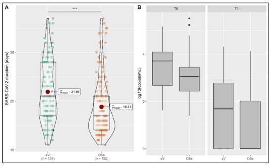 Comparison of OSs and αV carrier individuals. (A) The duration of infection significantly differed between OSs and αV carriers. The average day of resolution of infection is reported for each group. (B) Viral load and VLDS are shown between groups. Carriers of αV were found with a higher viral load (p < 0.03); *** p < 0.001.