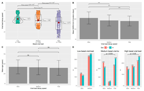 Analysis of the αV carriers group. (A) VLDS showed to be dependent on the basal viral load, proving the need of stratifying according to viral load inside the group. (B) The duration of infection significantly differs between individuals with slow and fast VLDS. (C) Age did not show a significant difference with respect to individuals with different VLDS. (D) Sex distribution was different among individuals with a high viral load. Male sex was found to be significantly different between the individuals characterized by fast and medium as well as slow and medium VLDS. n= number of subjects; *** p < 0.001; ns: not significant.