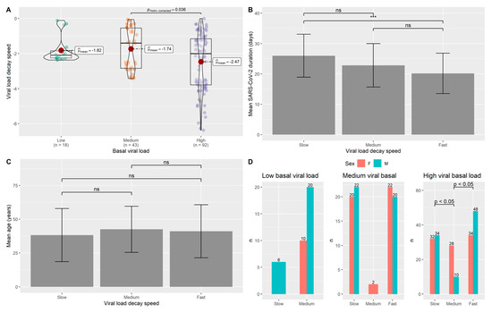 Similar to the OSs carriers, the VLDS related to the αV carriers was found as dependent on the basal viral load and determinant for the duration of infection (Figure 3A,B). A significant difference was found between medium and high basal viral load classes. The duration of infection was dependent on the basal viral load, with a significant difference between individuals with slow and fast decay of viral load (Figure 3B). Cohen’s d = 0.84 with a statistical power of 0.99 was obtained for this comparison. Age did not reach statistical significance as a contributor to different VLDS (Figure 3C). The VLDS groups were differentiated by sex composition. In fact, sex reached a statistical significance in the group of individuals with high viral load, in which male sex was prevalent among individuals with fast and slow VLDS compared to medium VLDS (Figure 3D). Cohen’s w values were computed and a w = 0.50 (statistical power= 0.98) and a w = 0.73 (statistical power= 0.99) were obtained for the comparisons between slow VLDS and medium VLDS as well as medium VLDS vs. fast VLDS individuals with high viral load, respectively (Supplementary Materials: Table S2).