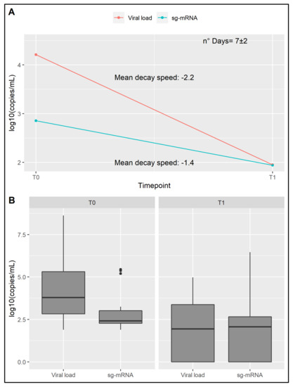 Assessment of sg-RNA component. (A) Representation of the sg-RNA concentration and corresponding viral load decay over time. (B) sg-RNA concentration and corresponding viral load reported for the deemed timepoints. Both sg-RNA concentration and viral load are reported in log10 copies/mL.