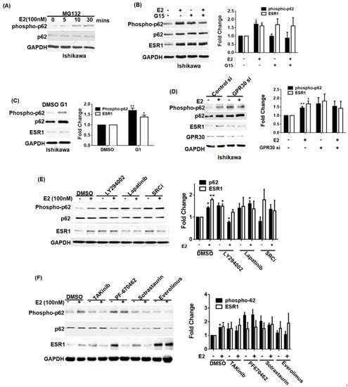 Activation of GPR30 by 17β-estradiol promotes p62 phosphorylation and estrogen receptor α (ESR1 expression). (A) Ishikawa cells were pretreated overnight with the proteasome inhibitor MG132 (concentration: 5 μM) in phenol red-free OPTI-MEM medium. After harvesting, cells were exposed to 17β-estradiol (100 nM) at the reported time points. Phosphorylated and total p62 were detected using specific antibodies; endogenous GAPDH served as a loading control. (B) A pharmacological GPR30 antagonist (G15) inhibited 17β-estradiol-induced p62 phosphorylation and ESR1 expression. Ishikawa cells were starved overnight in presence of the proteasome inhibitor MG132 (concentration: 5 μM) in phenol red-free OPTI-MEM medium. On the next day, cells were pretreated with either G15 (100 nM) or a vehicle for 30 min and subsequently exposed to 17β-estradiol (100 nM) or a vehicle for 30 min. Protein levels of phosphorylated and total p62, ESR1, and GAPDH were examined with Western blot. Results for phosphorylated p62 and ESR1 were normalized for endogenous p62 and GAPDH expression levels. The fold changes for phosphorylated p62 and ESR1 protein levels are reported in the right panel. (C) A pharmacological GPR30 agonist (G1) enhanced p62 phosphorylation and ESR1 expression. Ishikawa cells were starved overnight in presence of the proteasome inhibitor MG132 (concentration: 5 μM) in phenol red-free OPTI-MEM medium and subsequently treated with G1 (10 nM). Protein levels of phosphorylated and total p62, ESR1, and GAPDH were examined with Western blot. Results for phosphorylated p62 and ESR1 were normalized for endogenous p62 and GAPDH expression levels. The fold changes for phosphorylated p62 and ESR1 protein levels are reported in the right panel. (D) Ishikawa cells were transfected with control or GPR30 siRNA for 72 h and subsequently exposed to 17β-estradiol (100 nM) or a vehicle for 30 min. Protein levels of phosphorylated and total p62, ESR1, and GAPDH were examined with Western blot. Results for phosphorylated p62 and ESR1 were normalized for endogenous p62 and GAPDH expression levels. The fold changes for phosphorylated p62 and ESR1 protein levels are reported in the left panel. (E,F) GPR30 downstream signaling pathways involved in p62 phosphorylation and ESR1 expression. Ishikawa cells were starved overnight in presence of the proteasome inhibitor MG132 (concentration: 5 μM) in phenol red-free OPTI-MEM medium and subsequently treated for 30 min with the following compounds: a PI3K inhibitor (LY294002), an EGF receptor inhibitor (lapatinib), a SRC inhibitor (SRCi), a TAK inhibitor (takinib), a casein kinase inhibitor (PF-670462), a PKC inhibitor (sotrastaurin), and an mTOR inhibitor (everolimus). Protein levels of phosphorylated and total p62, ESR1, and GAPDH were examined with Western blot. Results for phosphorylated p62 and ESR1 were normalized for endogenous p62 and GAPDH expression levels. The protein levels in vehicle control absence of E2 treatment as one. Results are expressed as mean ± standard errors from three independent experiments. Statistical significance was calculated with Student’s t-test * p < 0.05. ** p < 0.01.