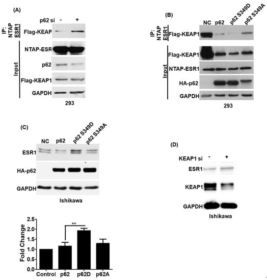 The KEAP1–p62 complex regulates estrogen receptor α (ESR1) protein expression. (A) NTAP-ESR1 and FLAG-KEAP1 were overexpressed in 293 cells either with or without p62 silencing. Following purification with streptavidin (NTAP-ESR1 construct), co-precipitated KEAP1 was detected using a FLAG antibody. (B) Two hundred and ninety-three cells were transfected with NTPA-ESR1, FLAG-KEAP1, and different HA-p62 constructs —including wild-type p62, the p62 S349D mutant (which mimicked the biological action of phosphorylated p62), and the p62 S349A mutant (which was unable to undergo phosphorylation). KEAP1–ESR1 complexes were identified using an anti-FLAG antibody. (C) HA-p62 (wild type), HA-p62 S349D, and HA-p62 S349A were overexpressed in Ishikawa cells. Subsequently, ESR1 and p62 protein levels were assessed using anti-ESR1 and HA antibodies, respectively. GAPDH served as loading control. The fold changes in ESR1 protein levels are reported in the bottom panel. Results are expressed as means ± standard errors of the mean from three independent experiments; ** p < 0.01. (D) KEAP1 silencing induced ESR1 expression in Ishikawa cells. Protein levels of ESR1, KEAP1, and GAPDH were examined with Western blot.