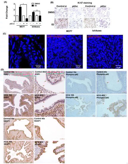 Phosphorylated p62 promotes estrogen receptor α (ESR1) expression. The results of (A) the BrdU assay and (B) Ki-67 staining revealed that the proliferation capacity of cells with silenced p62 expression was lower than that of control cells. MCF7 and Ishikawa cells were transfected for 48 h with control siRNA or p62 siRNA and subsequently exposed to 17β-estradiol (100 nM) or a vehicle for 24 h. Results are expressed as means ± standard errors of the mean from three independent experiments. * p < 0.05, ** p < 0.01. (C) The results of proximity ligation assay confirmed the interactions between ESR1, KEAP1, and p62 in human endometrial specimens. Staining was performed with antibodies raised against ESR1, KEAP1, and p62, with IgG serving as negative control. The red dots indicate protein interactions. The nuclei were stained with DAPI, which showed blue color. (D) Immunohistochemical staining of ESR1 (left panel), phosphorylated p62 (right panel) and KEAP1 (lower panel) in uterine epithelial cells of mice fed with a vehicle (upper panel) or hydroxychloroquine (HCQ, 50 mg/kg/day, lower panel) five days a week (magnifications: 10× and 40×). The arrowheads indicate different expression levels of ESR1 and phosphorylated p62.