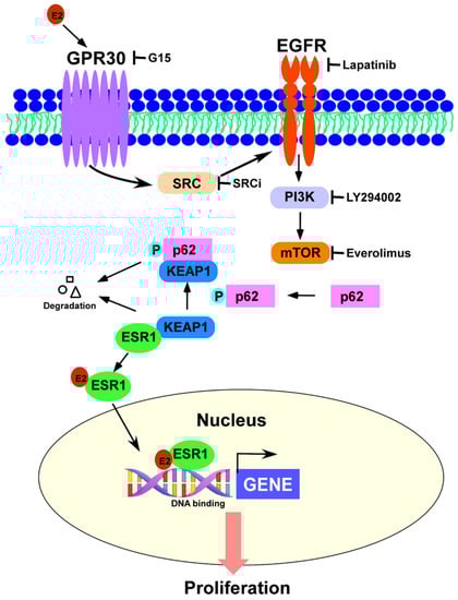 GPR30 activation by 17β-estradiol elicits the SRC/EGFR/PI3K/Akt/mTOR signaling pathway and promotes p62 phosphorylation—which in turn induces ESR1 protein expression through estrogen receptor α (ESR1) detachment from a complex formed with KEAP1. This complex interplay provides a link between the rapid-signal effects of estrogens (mediated by GRP30) and their canonical genomic effects (mediated by ESR1).