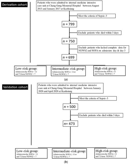 Overall, 3377 patients were admitted to three ICUs between August 2013 and January 2017. We excluded patients without a diagnosis of sepsis (n = 2578), those who died within 3 days after admission to the ICU (n = 49), and those with incomplete clinical data needed for the calculation of the NEWS2 and SOFA score at admission and on day 3. Finally, 699 patients with sepsis were enrolled as a derivation cohort (Figure 1a) and 473 patients were enrolled as a validation cohort in our study (Figure 1b).