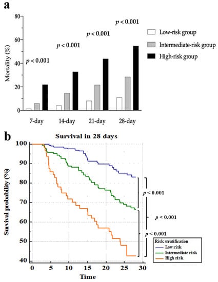 As shown in Table S3 and Figure 2a, the mortality rates differed between the three groups at 7, 14, 21, and 28 days. In the high-risk group, 49 of 87 patients (44.9%) died within 28 days. Figure 2b demonstrates three separate survival lines. In Table 5, the crude hazard ratio of the intermediate-risk group compared to the low-risk group was 2.334 (adjusted ratio: 1.884). The crude hazard ratio was 6.810 for the high-risk group (adjusted ratio: 5.361).