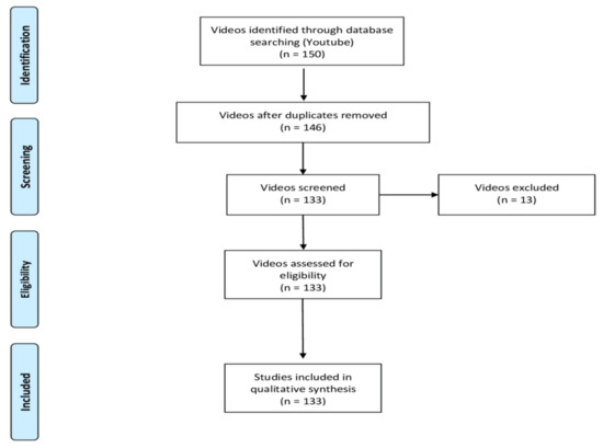 The first 150 videos available to viewers were selected. The aim was to replicate a simple search strategy that could be conducted by anyone, so the search was not restricted using filters. Hence, YouTube sorted video results by their relevance according to the patented ranking algorithm active on that specific day. All the videos were added to a spreadsheet and then submitted for screening for duplicates, as well as in order to apply the research team’s inclusion and exclusion criteria. Exclusion criteria were non-English language, duplicated videos, pelvic floor exercises for women, and/or related to advertisements. Finally, 133 videos were assigned to 2 different examiners who viewed, analyzed, and evaluated them independently over a period of 5 weeks (Figure 1).