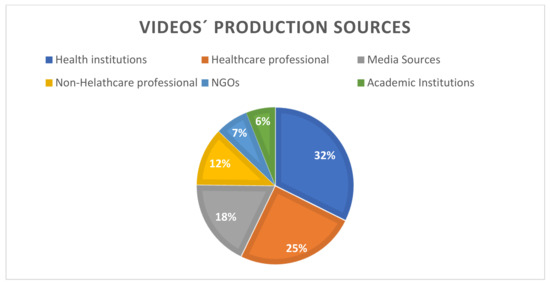 Most of the videos (32.3%) were produced by Health Institutions, followed by Healthcare Professional (24.8%), Media sources (18.0%), Non-Healthcare Professional (12.0%), NGOs (6.8%), and Academic Institutions (6.0%) (Figure 2).
