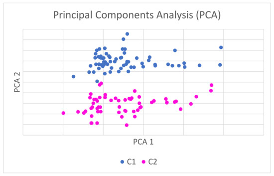 The second analysis was a statistical one using a t-test and Wilcoxon test, illustrating how significant the differences between both classes are from the perspective of each variable. The statistical analysis also shows the relevance of each variable regarding the grouping of the samples into C1 and C2, in each of the two cases. The t-test determines whether the means of the variables in both datasets are significantly different from each other. The null hypothesis (H0) assumes that there is no difference between groups. When the statistical analysis yields 1, it means that there is enough evidence to reject this hypothesis, and if it results in 0, the null hypothesis must be accepted. The accepted value level of significance or error probability is alpha < 0.05. Consequently, the Wilcoxon test essentially calculates the difference between each set of pairs and analyzes these differences, whereas H0 refers to the equality of the population medians of two groups of samples (C1 and C2).