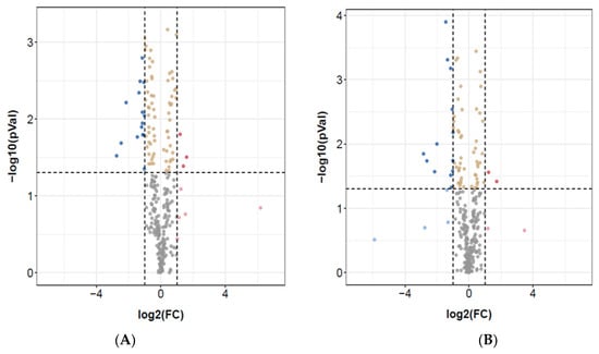 Differential expression analysis, as shown in the volcano plot, identified significant known and novel miRNAs (Figure 1) using |log2 fold change| and p ≤ 0.05 criteria. For example, the ASD vs. control group showed 15 down-regulated and 3 up-regulated miRNAs out of 269 detected (Figure 1A), whereas in the ASD vs. Siblings group, there were 2 up-regulated and 13 down-regulated miRNAs out of 267 detected (Figure 1B).