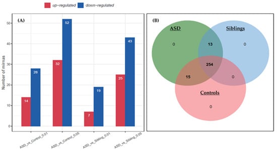 Differential expression of miRNAs in ASD and control LCLs as well as in ASD and siblings. (A) Total number of miRNA expression at p < 0.01 and p < 0.05. (B) Venn diagram of all the dysregulated miRNAs in the groups, showing miRNAs which are unique and common in the three groups.