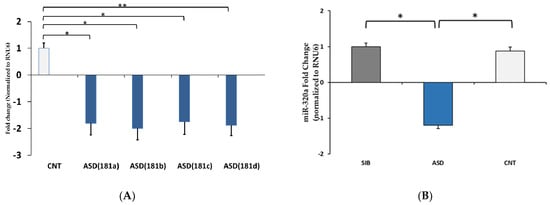 qPCR validation of miRNA expression: (A) miR-181a and other miR-181 family members (181b-5p, miR-181c-5p, and miR-181d-5p) and (B) miR-320a in LCLs. SIB = siblings; CNT = controls; ASD = autism spectrum disorder; data are means ± SEM of n = 9–10 samples in each category. Error bars represent standard error of the mean. miRNA expression was normalized to RNU6 for each group. * p ≤ 0.05.; ** p ≤ 0.01.