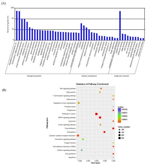 Enrichment analysis of the differentially expressed miRNAs. (A) GO function classification of the target genes of differentially expressed miRNAs. The top 25, 15, and 10 GO terms in biological processes, cellular components, and molecular functions, respectively. (B) The top 20 enriched KEGG signaling pathways of the target genes of differentially expressed miRNAs.