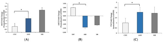 Gene expression of (A) AKT serine/threonine kinase 3 (AKT3), (B) AKT serine/threonine kinase 2 (AKT2), and (C) tumor necrosis factor α (TNF) in ASD, controls, and siblings. CNT = controls, ASD = autism spectrum disorder, and SIB = siblings. Data are means ± SEM of n = 9–10 samples in each category. Error bars represent standard error of the mean. Gene expression was normalized to GAPDH for each group. * p ≤ 0.05.