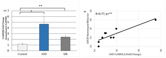 (A) CaMKII β expression in LCLs. (B) Correlation of CaMKII β expression and stereotyped behavior per ADOS criteria. CNT = control, ASD = autism spectrum disorder, and SIB = Siblings; n = 9–10 in each group; * p ≤ 0.05.; ** p ≤ 0.01.