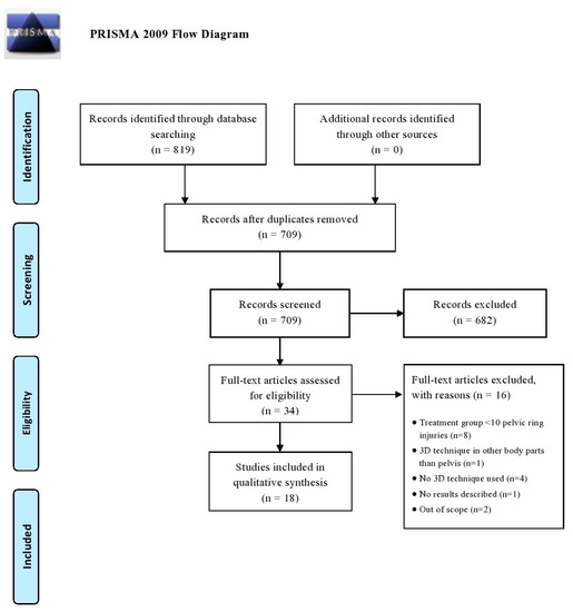 Eligible studies for inclusion reported either on (1) the use of 3D techniques in the virtual planning of operative treatment of pelvic ring injuries; (2) 3D printed templates with fracture visualization; (3) 3D printed templates with pre-operative plate contouring; (4) 3D virtual planning of screw trajectories; (5) 3D custom-made implants with guides; and (6) 3D navigation for screw placement. Patients should be 18 years or older and patients with fragility fractures of the pelvis (FFP) were included as well. Outcomes directly related to the operative treatment should be reported. These included operation time, blood loss, screw malposition rate and fluoroscopy time or fluoroscopy frequency, fracture reduction and functional outcome. These outcome measures represent the efficiency and accuracy of the surgical procedure itself. We hypothesized that 3D assisted surgery could have an effect on these measures, which is the rationale to choose these outcome measures. Moreover, these are widely used for assessing pelvic ring surgery related to patient outcomes [9,10,11]. Except for case studies with N < 10 and conference abstracts, all study designs were accepted for inclusion. Concerning language, studies written in English, German, Spanish, French and Dutch were included. Biomechanical and animal studies were excluded, as well as studies about classification of injuries by means of 3D techniques. Moreover, studies that included outcomes after both pelvic ring injuries and acetabular fractures and that did not differentiate between these injuries in terms of outcomes were excluded.