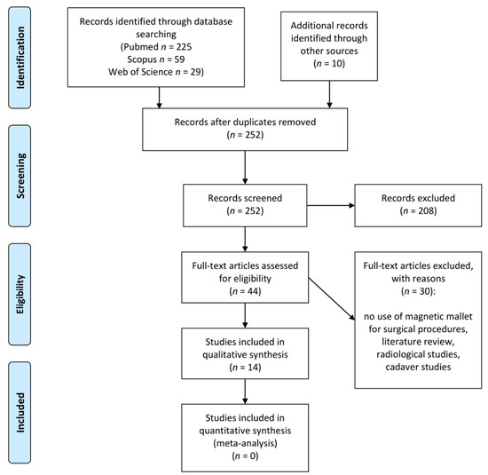 The search strategy yielded records (225 from PubMed, 59 from Scopus, 29 from Web of Science); and 10 additional articles were identified through a hand search. After the removal of duplicates, 252 records remained. After title and abstract screening, 44 articles were identified for full-text retrieval and analysis. Of these, 30 did not meet the inclusion criteria (articles not in English language, literature reviews, no use of magnetic mallet), and 1 article’s full-text was not retrieved. The remaining 14 articles were included in the systematic review; the included papers are listed in Table 1 according to study design, and type of intervention. None of the included studies were set up as a randomized clinical trial; therefore, none were included in the quantitative synthesis.