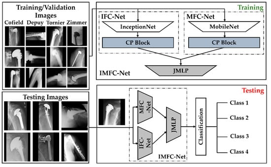 An overall flow diagram of the proposed method is presented in Figure 2. First, the images were input to the network, and augmentation was performed using the rotational invariant augmentation (RIA) [] technique during training. However, augmentation was not performed on the validation and testing datasets. Subsequently, IFC-Net and MFC-Net were trained and validated. The final classification of the test image was made in the testing phase based on the IMFC-Net output. The proposed framework was designed to propose a network to minimize the number of parameters, achieve high performance, and classify a shoulder implant test image accurately.