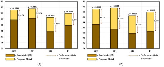 Significant performance gain of the proposed model using the t-test analysis in terms of accuracy (ACC), average precision (AP), average recall (AR), and F1.score (F1): (a) difference between the base model presented in [] and the proposed model (p-values), as well as the performance gain obtained using the proposed model compared to that of the base model [], and (b) difference between the base model presented in [] and the proposed model (p-values), along with the performance gain obtained using the proposed model compared to that of the base model [].
