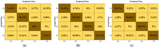 Moreover, we demonstrated the considerable performance of our model for each class in terms of the confusion matrix. The matrices in Figure 4 particularly characterize the anticipated number of TP, TN, FP, and FN data samples for the base models [,] and IMFC-Net. The diagonal elements of these matrices indicate the AR for each class. Our proposed model outperformed the base models with a considerable difference for each class, as shown in Figure 4. The AR value in Figure 4b (base model []) for all classes is greater than that of Figure 4a (base model []), except for C3. The underlying reason is discussed in Section 4, with a visual explanation of IFC-Net and MFC-Net. Figure 4c (the proposed model) shows that the AR value for each class is higher than 80%, except for C1. The underlying reason is discussed in Section 4 by analyzing C1 for the FN cases.