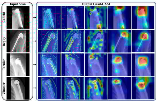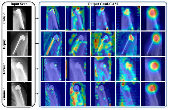 We used the power of DL models to design a robust shoulder implant system that assists the orthopedic field, particularly shoulder arthroscopy. Manual identification of implants in X-ray scans requires highly experienced surgeons with plenty of time because minor errors cause somber consequences [,,]. To address these problems, we propose an efficient DL-based classification ensemble network comprising our two designed CNNs (IFC-Net and MFC-Net) and a JMLP, as shown in Figure S2. We used the gradient-weighted class activation map (Grad-CAM) technique to illustrate the effectiveness of the two CNNs. Grad-CAM analyzes the gradient of the classification score with respect to the network-determined convolutional features and scores the significant region of the data []. In Figure 5 and Figure 6, we generated five Grad-CAMs of both CNNs for each class of the same input implant scan to guarantee a fair comparison. Figure 5 shows that IFC-Net appropriately learns the discriminative features of each class gradually. The visually discernible part of an implant lies in its head area, with a certain shape and number of holes. As shown in the rightmost column of Figure 5, IFC-Net successfully locates the discriminative part of the implants for all classes. In addition, Figure 6 shows that MFC-Net gradually learns the discriminative features of each class. The rightmost column in Figure 6 shows the visual class-specific regions obtained using MFC-Net. Furthermore, Figure 6 demonstrates that the class-specific regions, determined by MFC-Net, deviate from the visually discriminated regions and mingled with nondiscriminated regions. For example, the classes Cofield (first row) and Zimmer (last row) maximally deviate from the discriminated region, as compared to the other two classes (Depuy and Tornier). Therefore, the classification performance of the base model [] of MFC-Net for C1 (Cofield class) and C4 (Zimmer class) was less than that of the base model [] of IFC-Net for the same classes, which can be seen in the confusion matrix in Figure 4. However, Figure 6 shows that the class-specific region obtained by MFC-Net for the Tornier class (the third row) is larger in volume than that obtained by IFC-Net for the same class (the third row in Figure 5). Therefore, the classification performance of the base model [] of MFC-Net for C3 (Tornier class) was 3.33% higher than that of the base model [] of IFC-Net for the same class, which can be seen in the confusion matrix in Figure 4. Moreover, Figure 5 shows that the class-specific region obtained by IFC-Net for the Depuy class (the second row) is larger in volume than that obtained by MFC-Net (the second row in Figure 6). Therefore, the classification performance of the base model [] of MFC-Net for C2 (Depuy class) was 2.57% less than that of the base model [] of IFC-Net for the same class, which can be seen in the confusion matrix in Figure 4.