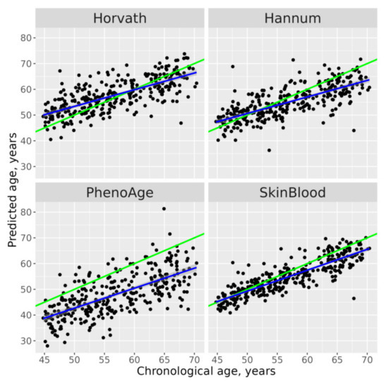 Scatterplots of chronological vs. epigenetic age by Horvath’s, Hannum’s, PhenoAge and Skin and Blood clocks. Diagonal green line corresponds to the predicted age equal to the chronological age, blue straight line corresponds to the linear regression.