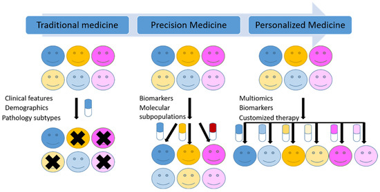 Schematic illustration of the transition from traditional medicine to precision medicine and future personalized medicine.